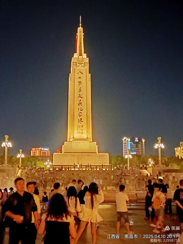 这是一座“八一南昌起义纪念塔”,它的周边设置了音乐喷泉。此时,浩瀚的夜空使人心旷,喷泉的水柱冲破夜空,与若明若暗的一轮明月相互撩拨。嘹亮的歌声令人振奋,有乐而忘忧之感。许许多多的人在这里留影录相。我激动地举起手机录下多段视频。录制中,看到那轮明月,我还是生出一股淡淡的忧思来。此时我也发现我与妻不在一起了。