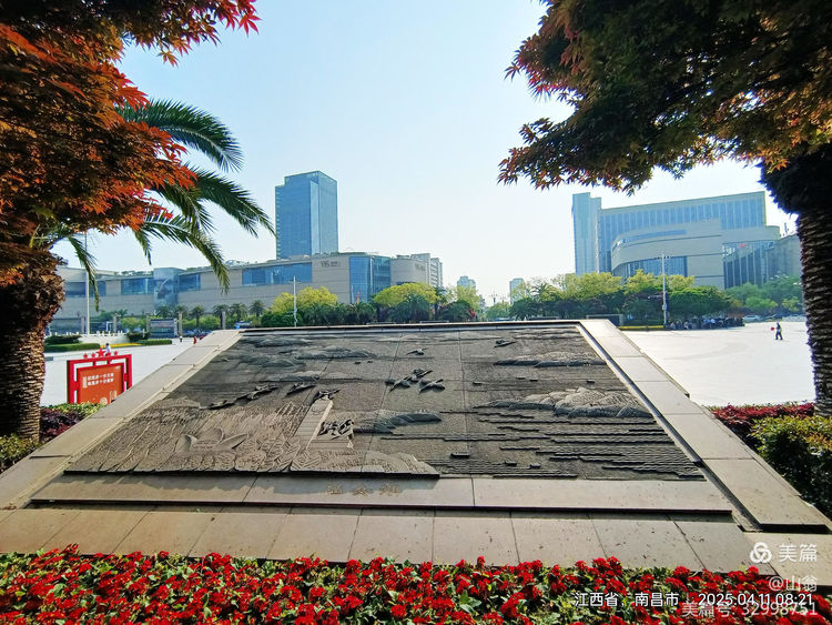 天晴气润,一路花香,到达广场时刚刚八点。一切都是明朗的,第一面军旗升起的地方,给我的感觉是祥和的。“南昌起义纪念塔”没有了喷泉水柱的衬托,更显庄严,一个几十人的旅团正在导游的指挥下合影。正对着纪念塔的是高高升起的国旗,国旗座台下镌刻着由前国家主席江泽民题写的“军旗升起的地方”几个大字。周边那些浮雕也仍在我的“法眼”中,我从从容容拍下多张照片。