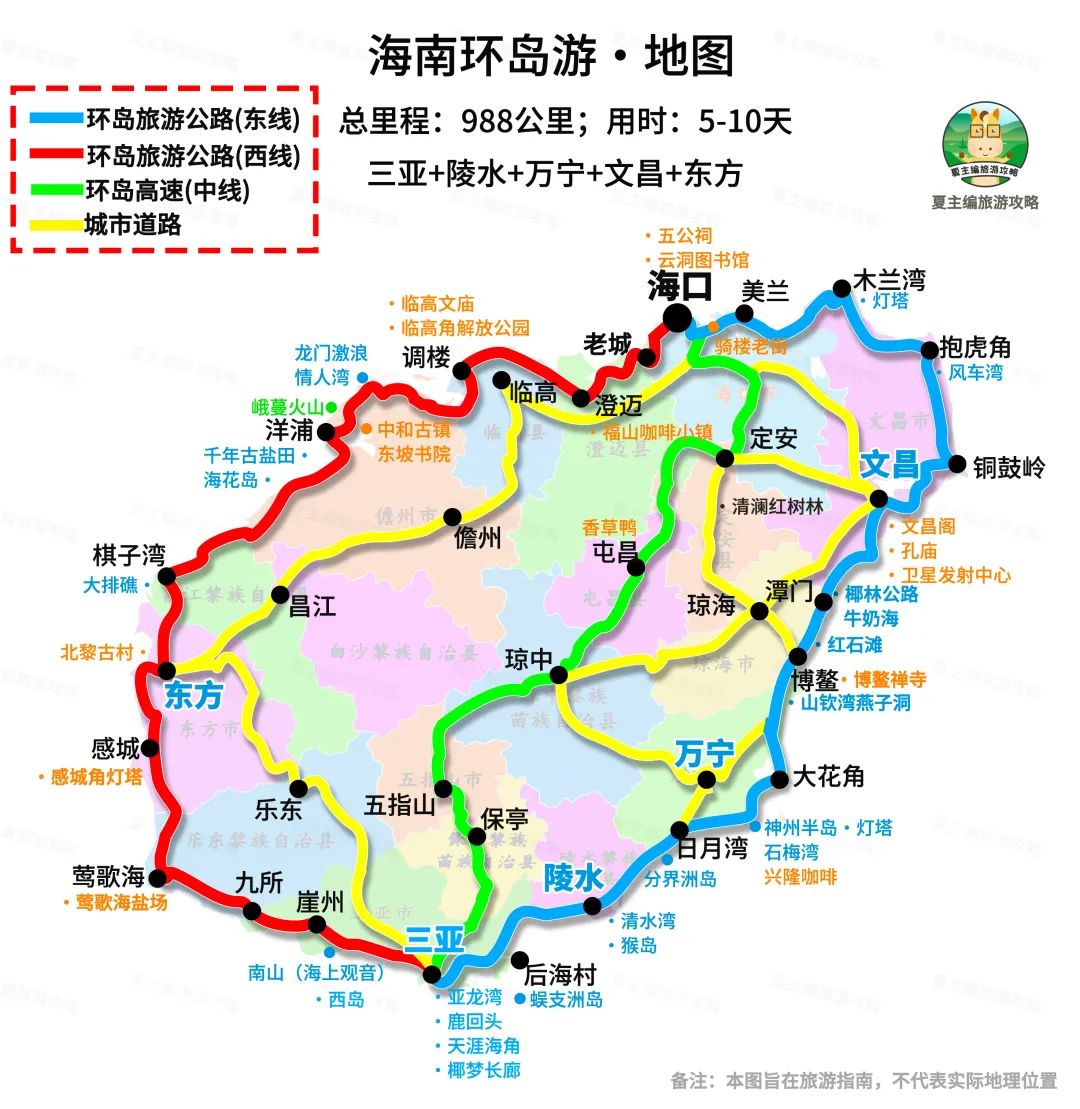 自驾信息:988公里,自驾需用时5-10天。全程海南环岛旅游公路,路况良好,无驾驶难度。海南油费普遍比内地高1元/升,驾驶电车更省钱。
