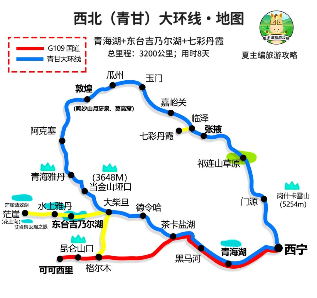 核心景点:青海湖、昆仑山、茶卡盐湖、茫崖翡翠湖、大柴旦水上雅丹、阿克塞魔鬼城、敦煌莫高窟、鸣沙山月牙泉、嘉峪关长城、七彩丹霞、祁连山、祁连草原、门源油菜花。