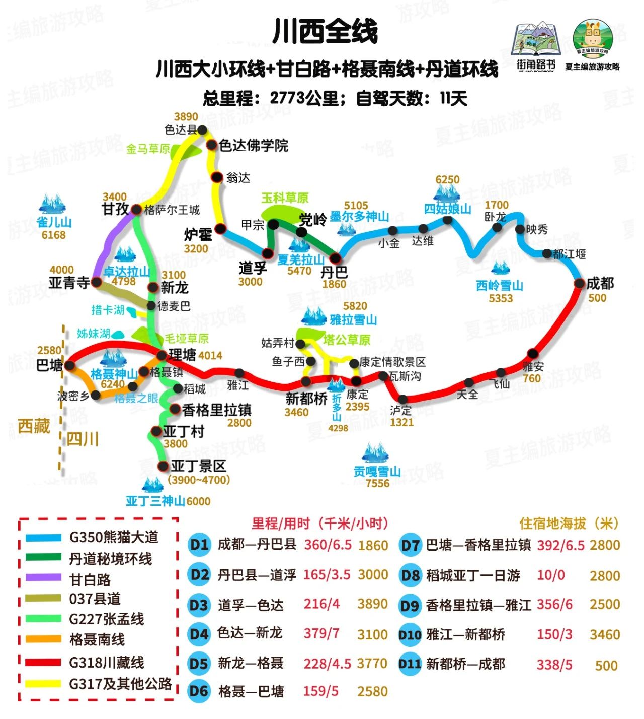 自驾信息:总里程2573公里,自驾需9-11天。线路海拔2000-4000米,一般不会有高原反应,盘山、临崖、邻水路段多,自驾有一定难度。