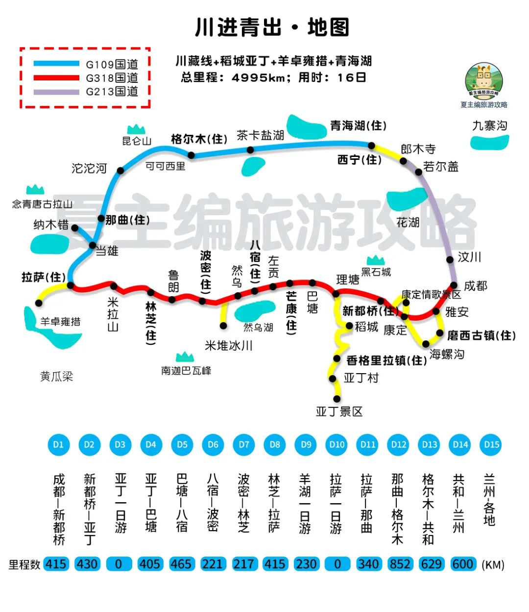 行程安排:成都→新都桥→亚丁→亚丁→巴塘→八宿→波密→林芝→羊卓雍措→拉萨→那曲→格尔木→共和→扎尕那→松潘→成都。
