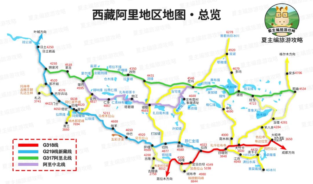 景观大道:G318中尼线、G219边境线、G216羌塘无人区公路、阿里中线、G317阿里北线、G109青藏线。