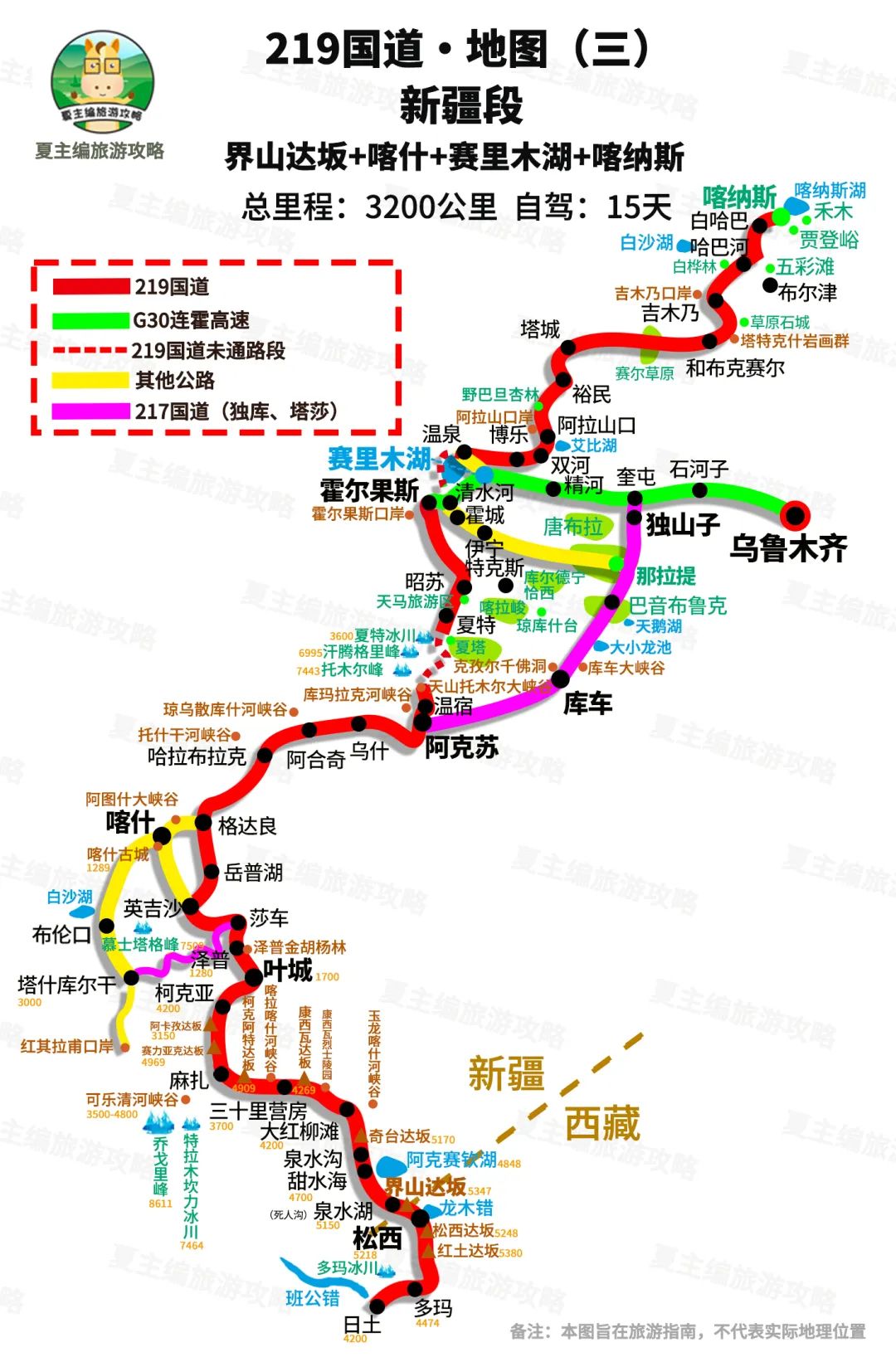 自驾信息:3300公里,自驾需9-13日。全程路况良好,电车、油车,皆可自驾。除了独库、伊昭、琼库什台这3大公路是盘山路之外,其余线路都很直,驾驶难度低。