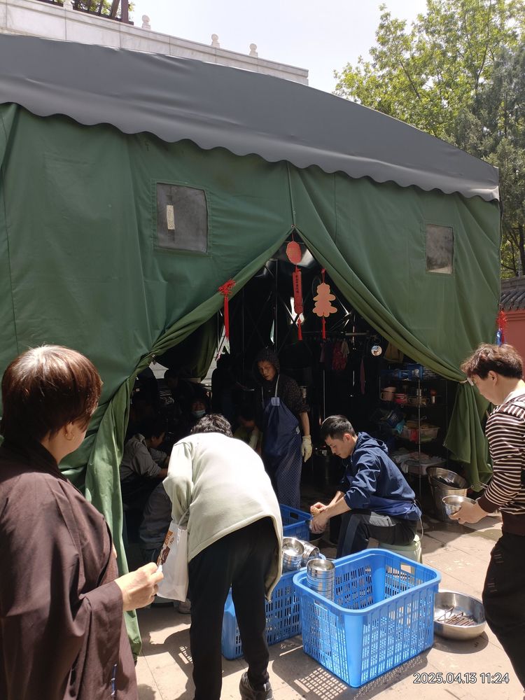 当我带着空碗筷走出斋堂,来到我们排队的转弯处,但见有一个临时搭建的洗碗筷用的蓬子,洗完及未洗的碗有几大竹筐,义务洗碗者足有七八个人,足见今天就餐者可达数百人。我本想自己将碗筷洗净,但见无法插足,只好放入筐内走开。