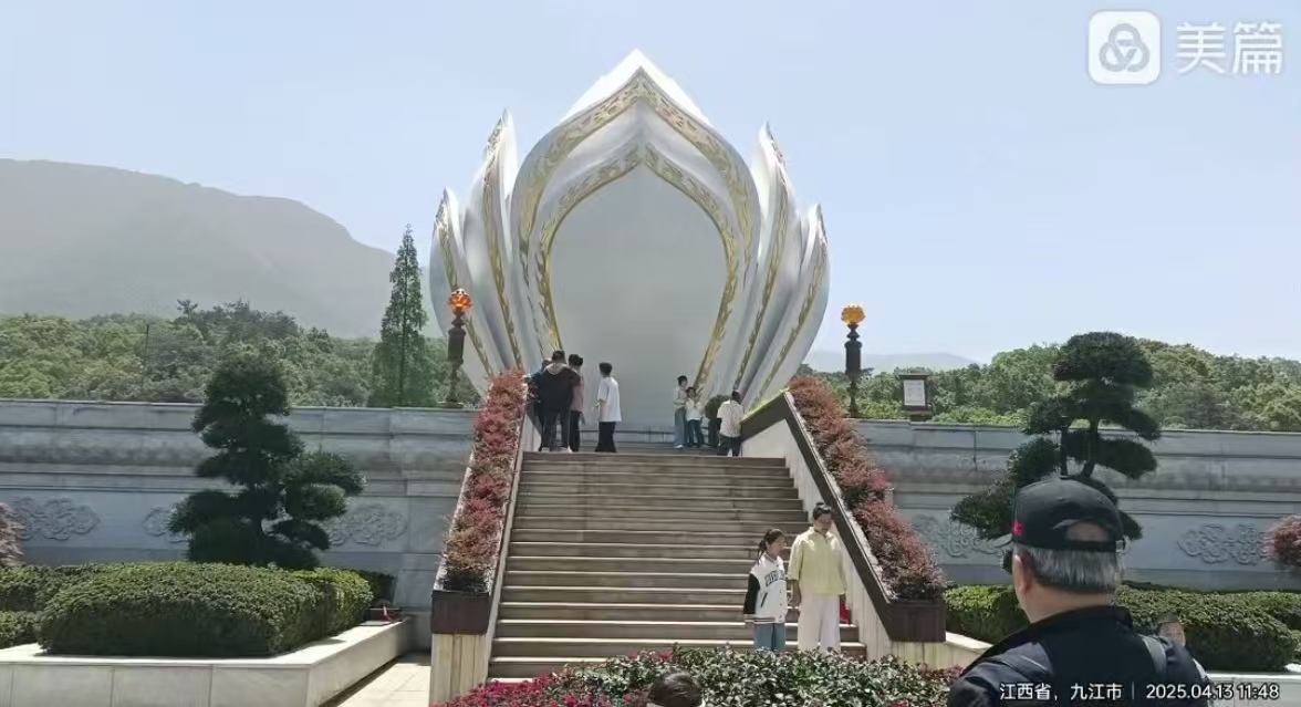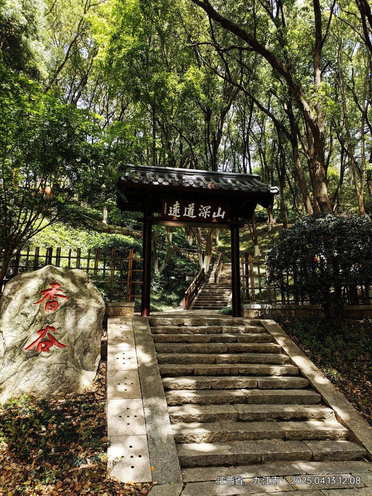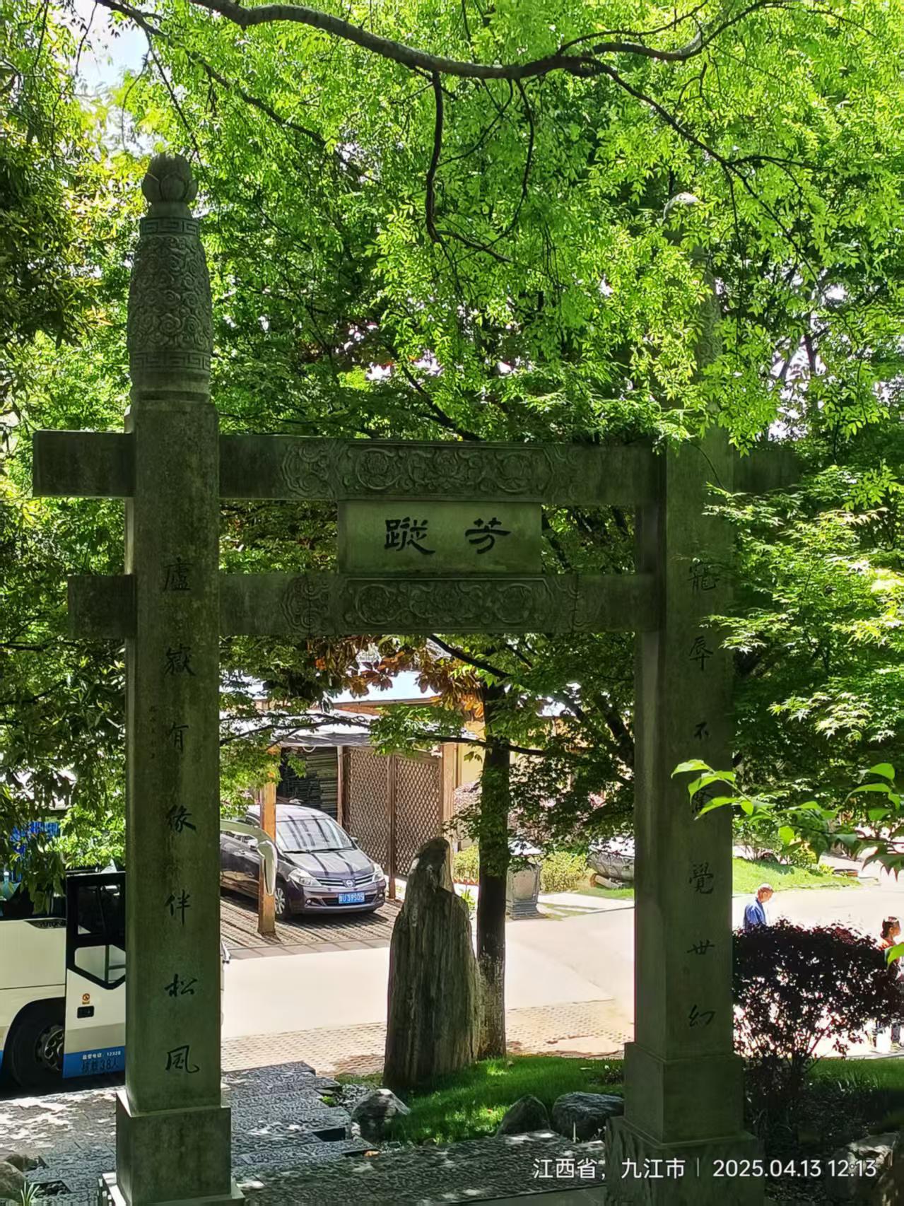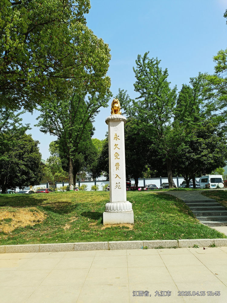 车子在两侧风光旖旎而又平坦的高速路上,平稳行驶近两小时,我们来到了东林寺的外围。一路上星尘、泥尘给我们作了一些介绍,说这里是佛教八大宗派中的一宗——净土宗(简称“净”)的发源地,寺内风景优美,可以吃免费的斋饭,甚至可以免费住宿体验。还说我们之所以早来,就是要赶着品一次这里的午斋。我听后真有点“高山仰止,虽不能止,心向往之”的感觉。
