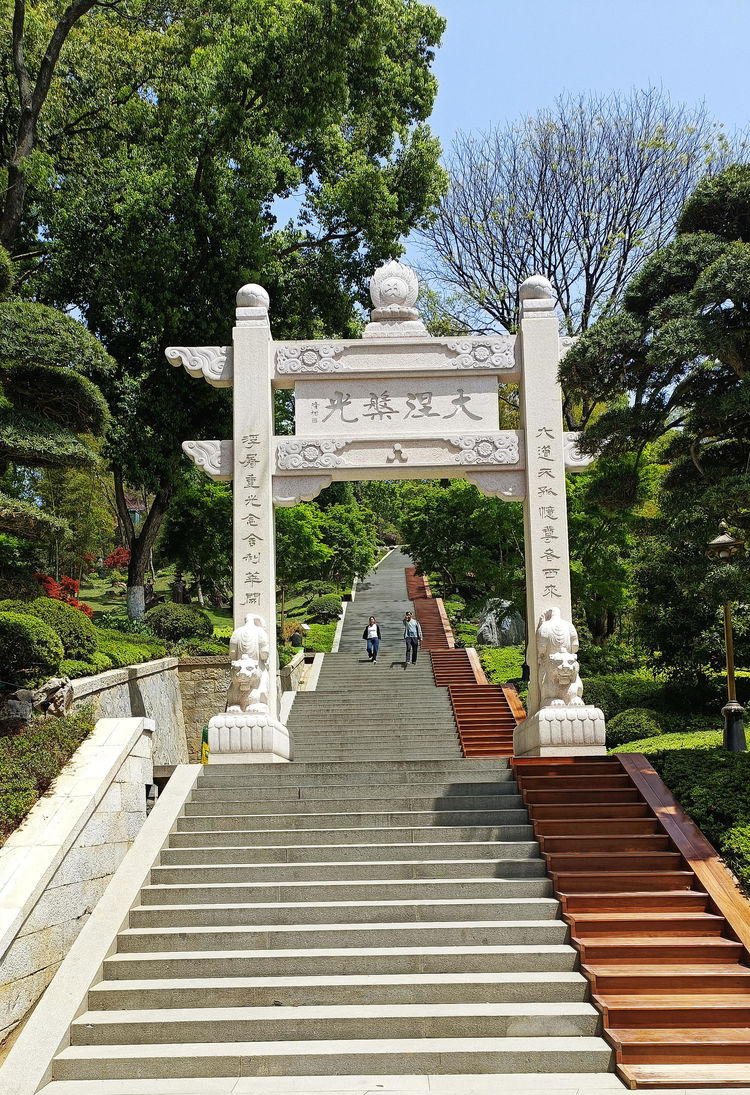 我们向寺院的大门走去,走过一座小桥。小桥的一头树荫下有三尊和尚铜雕,呈开怀大笑之态;桥的另一头立着一块石碑,上面文字刻写着一个“虎溪三笑”的典故。是说东晉慧還大師,高标脱俗,有送客不過虎溪之約。一日,陶渊明与陆修静來訪,相談甚欢,移時送之,不覺将过桥,忽闻虎鸣,三人恍悟,開怀大笑。