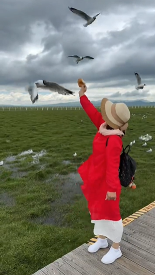 我们带着无比虔诚、崇敬的心情游览这片草原湿地,说来也怪,湿地外的停车场,晴空万里、艳阳高照,里面就阴云密布、冷风四起,游客都穿上了羽绒服,还瑟瑟发抖;上空盘旋飞翔的东草原鸥,顶着寒风,扑棱着双翅,追逐着游客们高举的食物逐食,无比顽强,就是当年红军精神的写照,也许就是英烈的显灵。