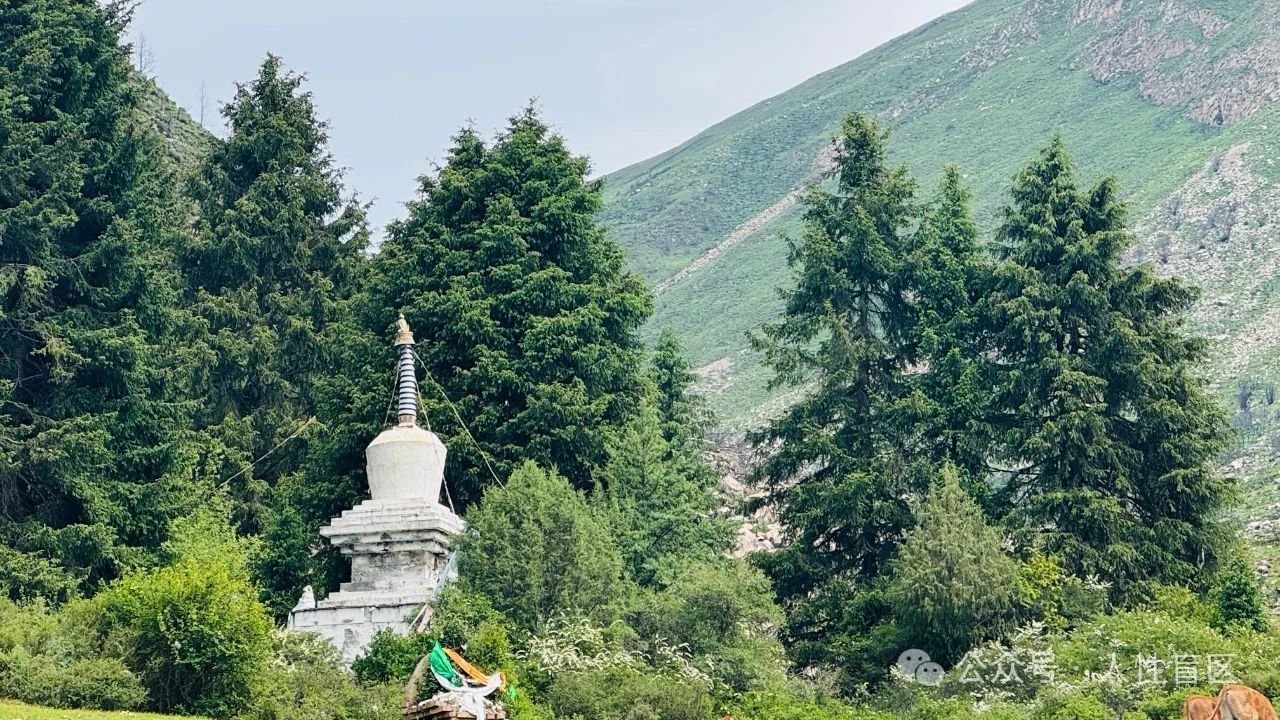 塔尖飘着袅袅炊烟,这是当地村民为祈求神灵保佑、亦或是家中先人护佑用的,里面焚烧着供奉的祭品,吃的、用的都可以,也可以是青稞秸秆,松树枝等一些有芳香味的植物枝叶。