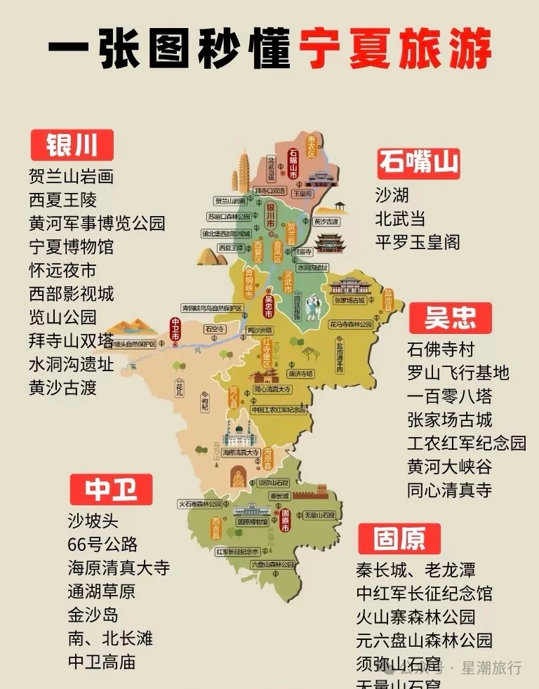 精华景点:沙湖、沙坡头、贺兰山岩画、银川镇北堡西部影城、中卫高庙、固原六盘山国家森林公园、吴忠黄河坛、石嘴山石炭井、西吉将台堡、海原关桥堡。