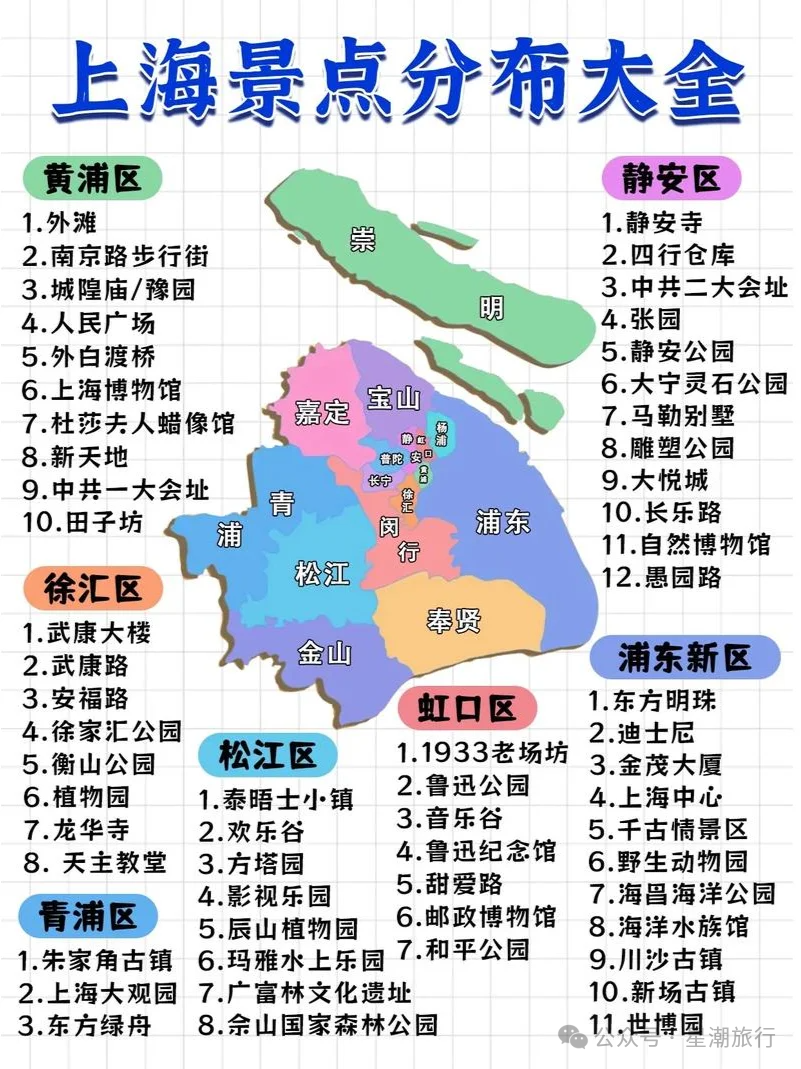 精华景点:外滩、东方明珠广播电视塔、上海迪士尼乐园、南京路步行街、上海博物馆、上海科技馆、田子坊、上海中心大厦、豫园、上海野生动物园。