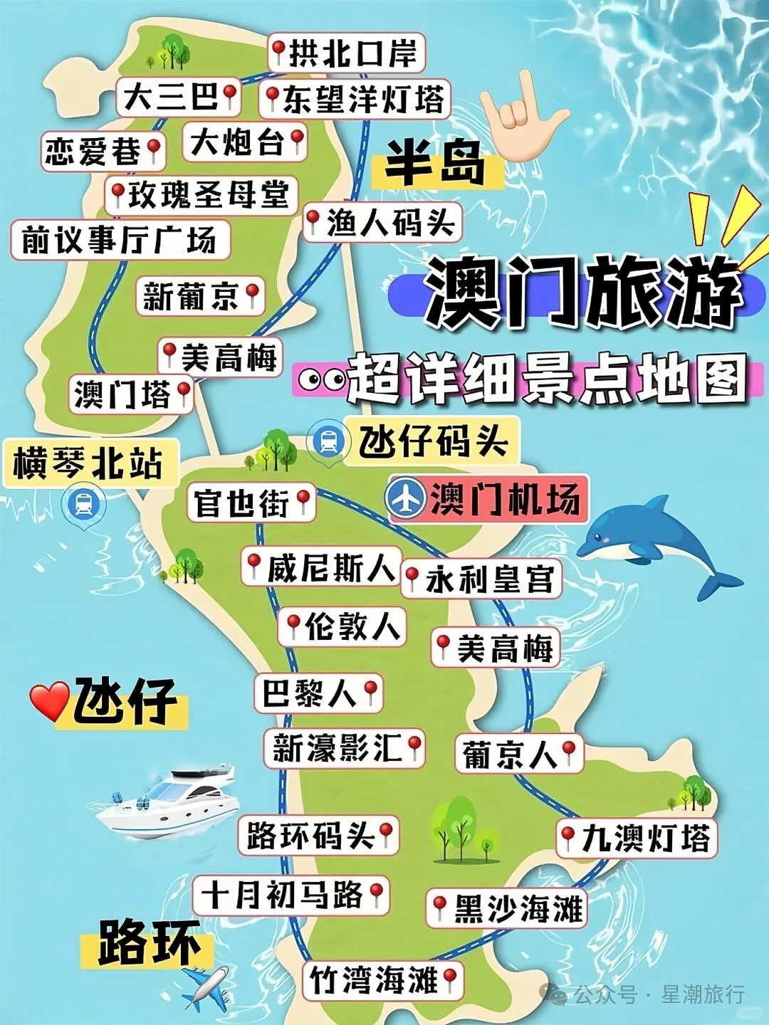 精华景点:大三巴牌坊、澳门塔、威尼斯人度假村、妈阁庙、澳门历史城区、官也街、路环岛、澳门博物馆、澳门艺术博物馆、澳门科学馆。