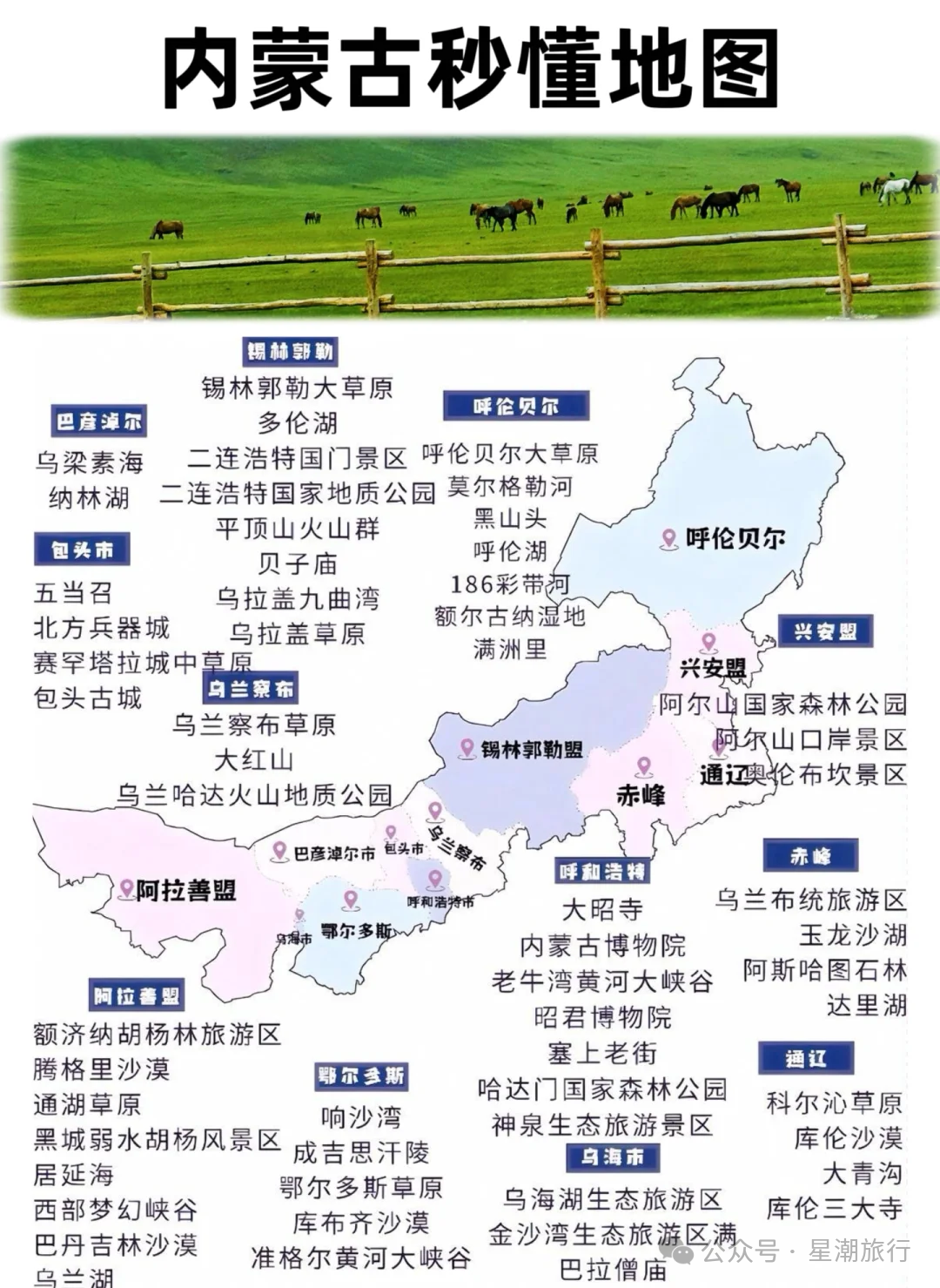 精华景点:呼伦贝尔大草原、额尔古纳河、阿尔山国家森林公园、响沙湾、赤峰克什克腾旗世界地质公园、鄂尔多斯成吉思汗陵、乌兰布统草原、阿拉善盟额济纳胡杨林、乌海湖、锡林郭勒盟元上都遗址。