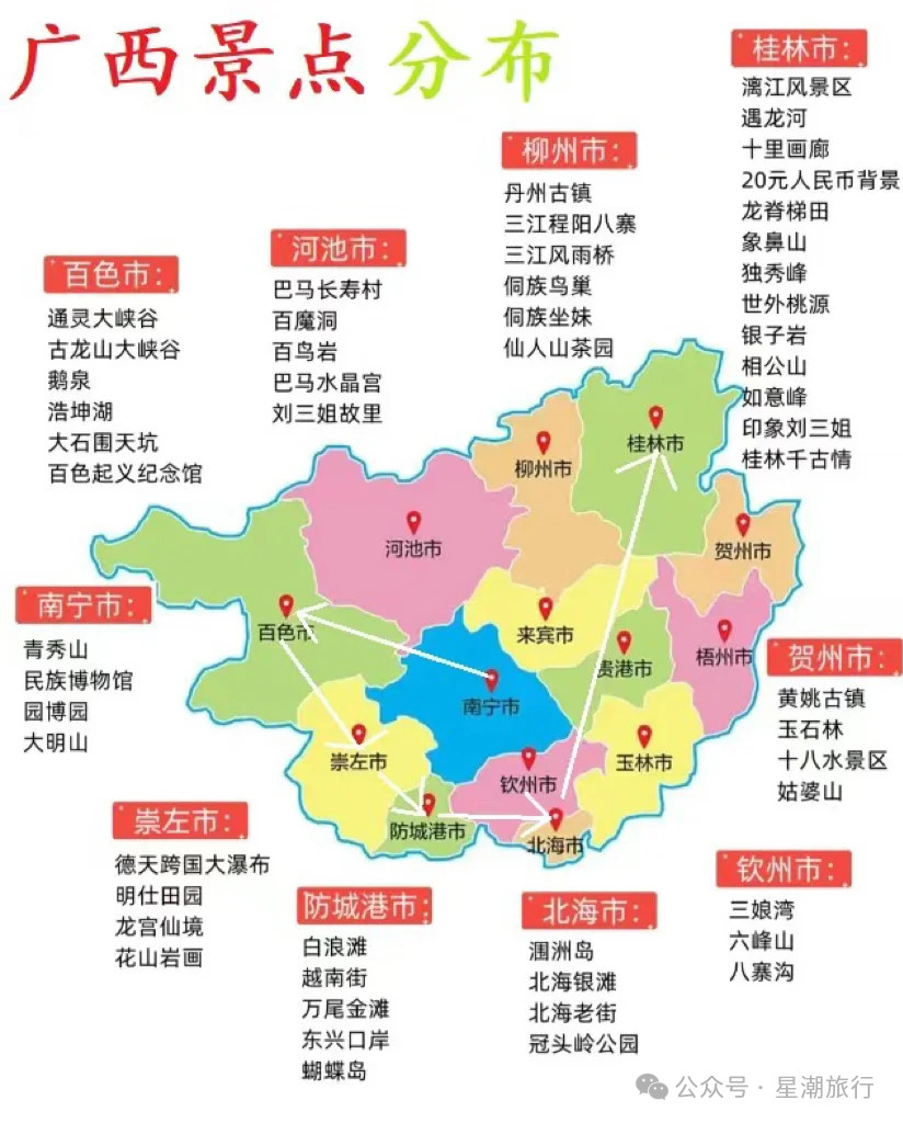 精华景点:桂林漓江、阳朔西街、漓江、龙脊梯田、涠洲岛、德天跨国瀑布、北海银滩、南宁青秀山、崇左德天瀑布、贺州黄姚古镇。