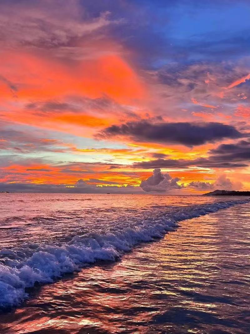 海水接住了所有光影。天边的绚烂被浪涛揉碎,化作水面上跳动的光斑,红的、紫的、银的,随波逐流。
