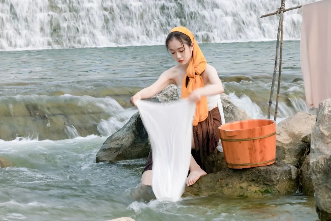 阳光透过柳条,洒在河边的青石上。三五浣衣女蹲踞在搓衣石旁,手持棒槌,捣衣声声。笑语与燕语相和,清越、动人。她们衣袖半卷,露出藕节似的手臂,在河水中来回摆动。阵阵细浪,将她们的身影剪成零碎的补丁。河水拍打着岸壁的石洞,发出咕嘟咕嘟的清脆声,自在且随意。