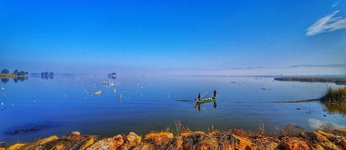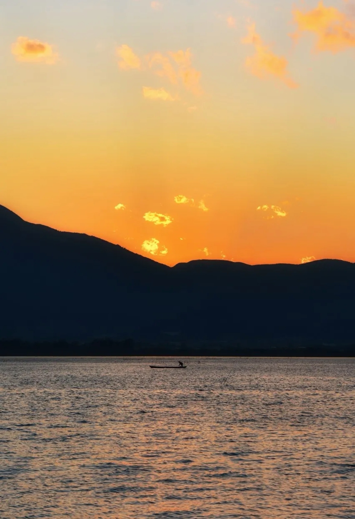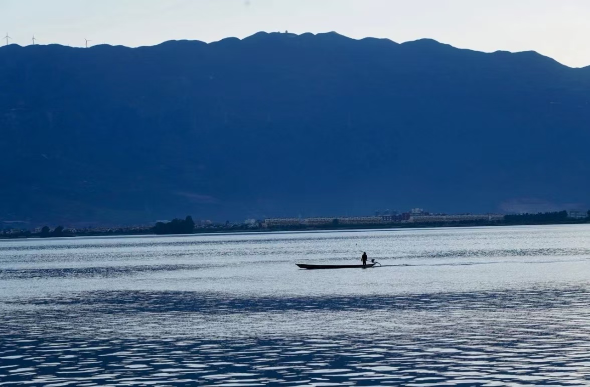 过去云南山区的人很少见海,就把大湖叫做“海”。大屯海湖面开阔得像无边的镜子,又像打翻的颜料盒。
