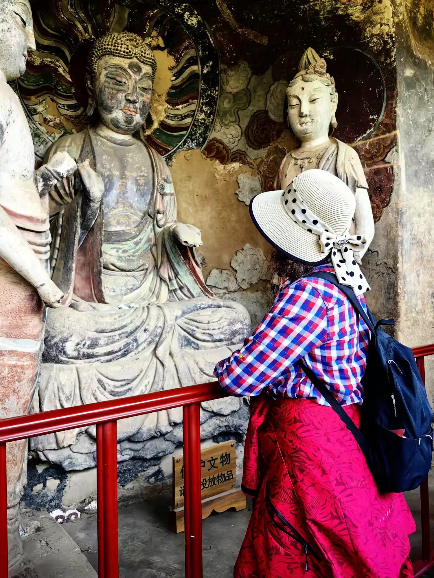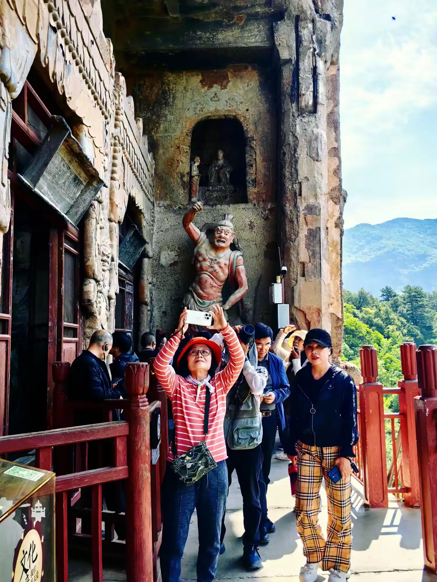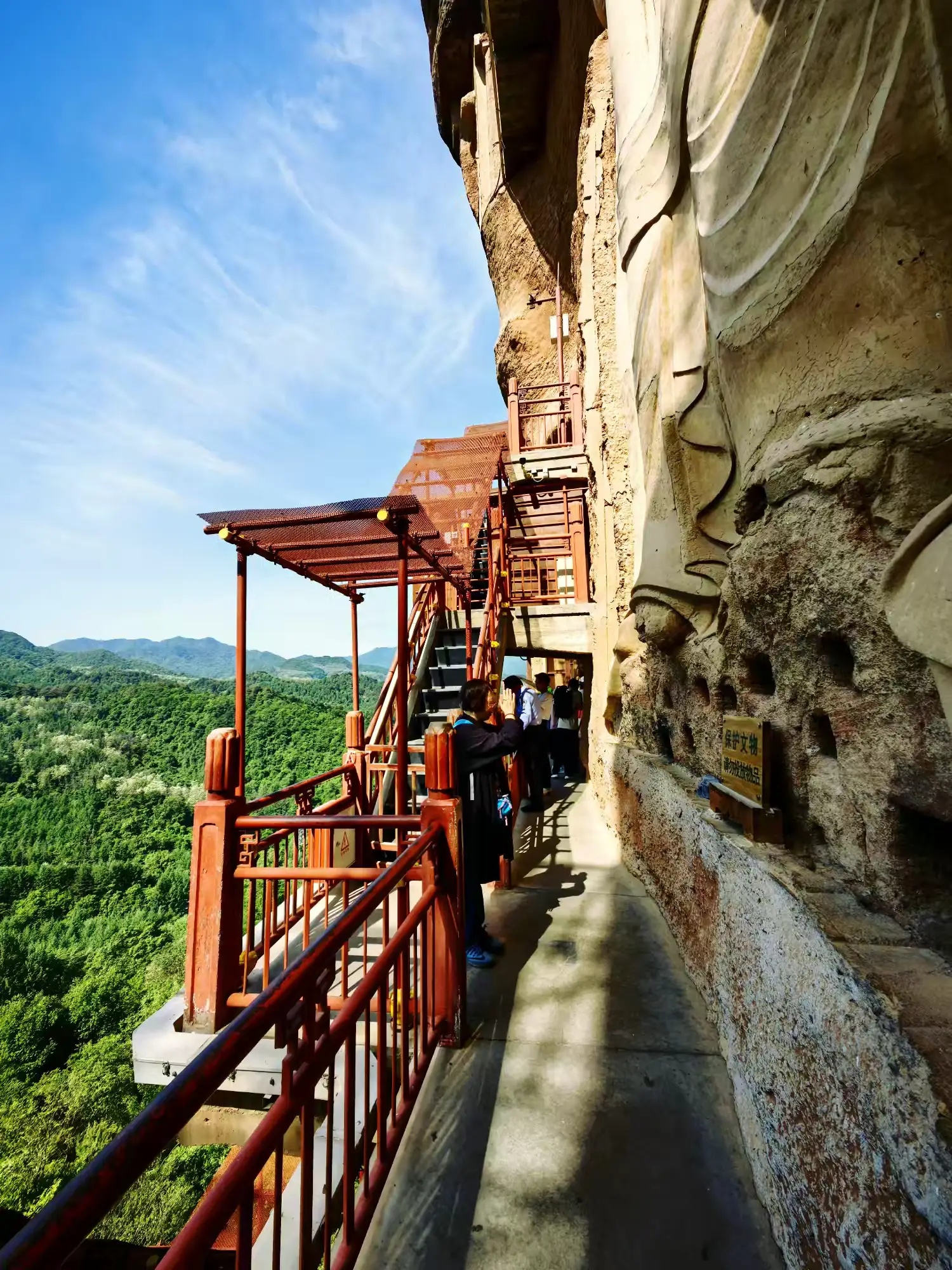 攀登麦积山栈道,对我是个考验。600米高的悬崖栈道,脚下悬空加轻微摇晃,令我心慌慌颤巍巍。有几次想打退堂鼓,可是又舍不得这些佛雕艺术。最后下决心,再险也要坚持。我和妹妹穿梭各个石窟间,被精彩的雕塑吸引竟忘记了害怕。站在山上俯瞰,秦岭山脉风光无限,让人顿感心胸开阔。