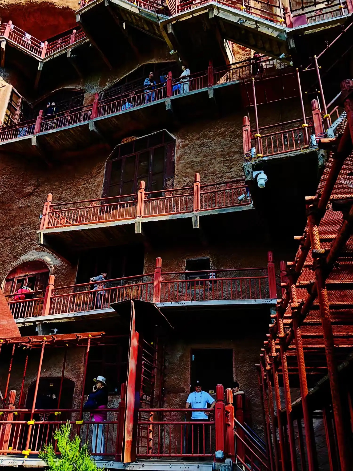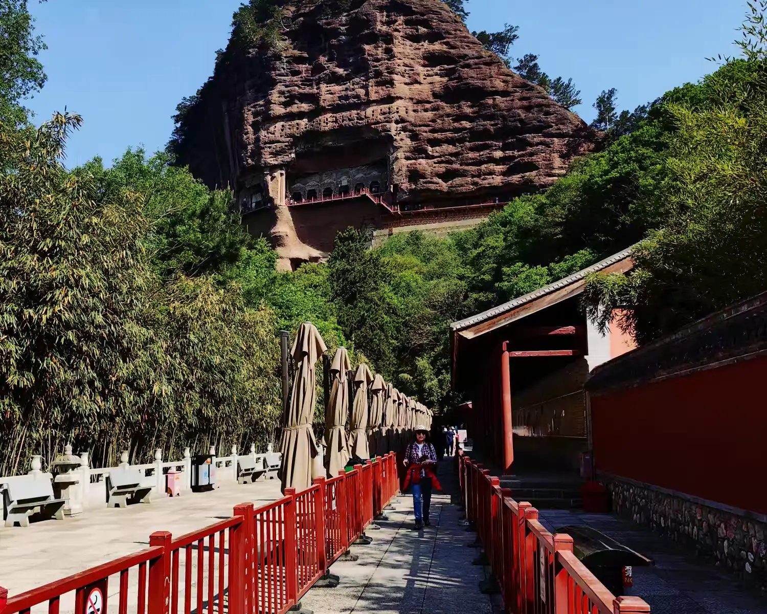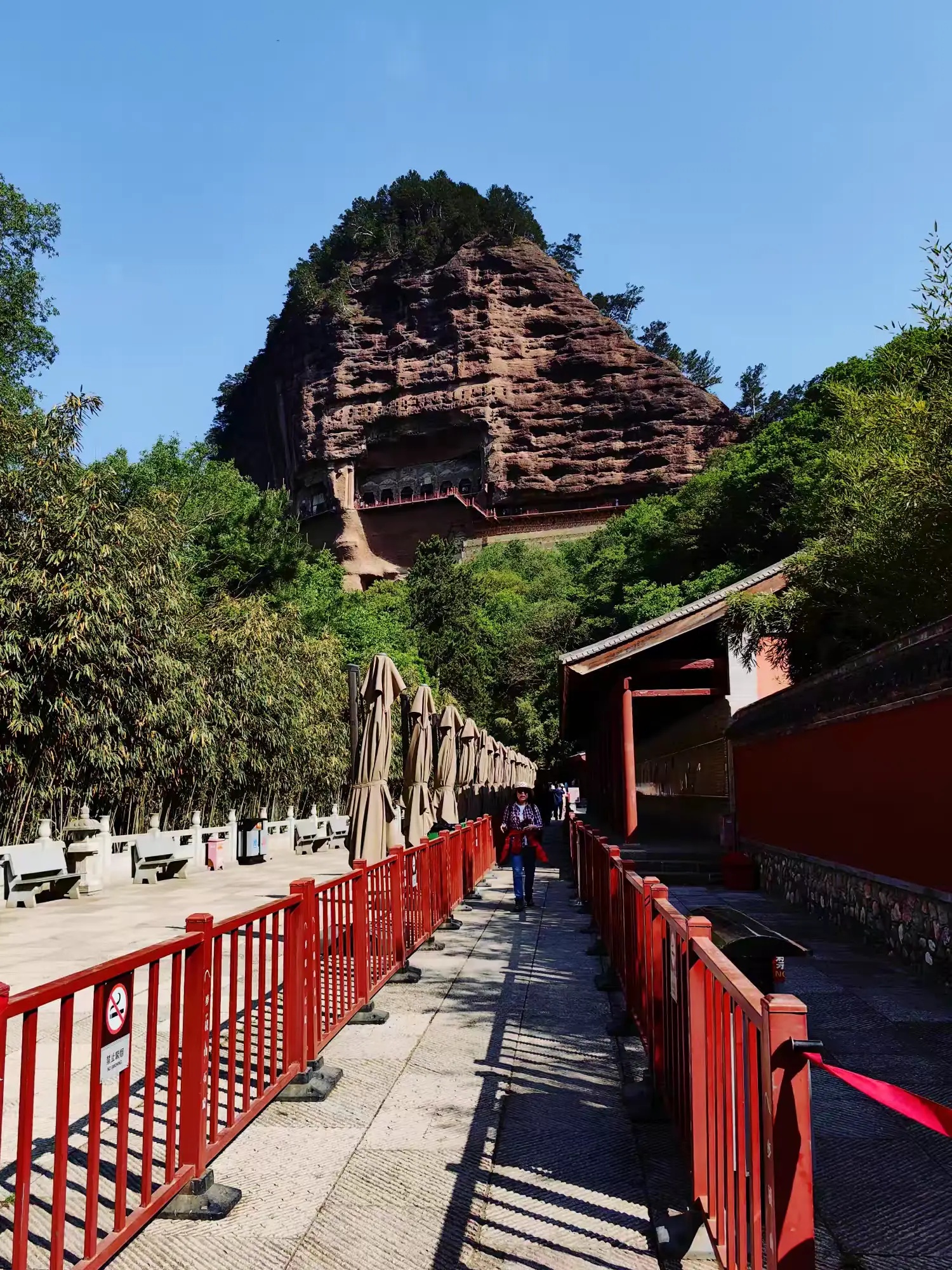攀登麦积山栈道,对我是个考验。600米高的悬崖栈道,脚下悬空加轻微摇晃,令我心慌慌颤巍巍。有几次想打退堂鼓,可是又舍不得这些佛雕艺术。最后下决心,再险也要坚持。我和妹妹穿梭各个石窟间,被精彩的雕塑吸引竟忘记了害怕。站在山上俯瞰,秦岭山脉风光无限,让人顿感心胸开阔。