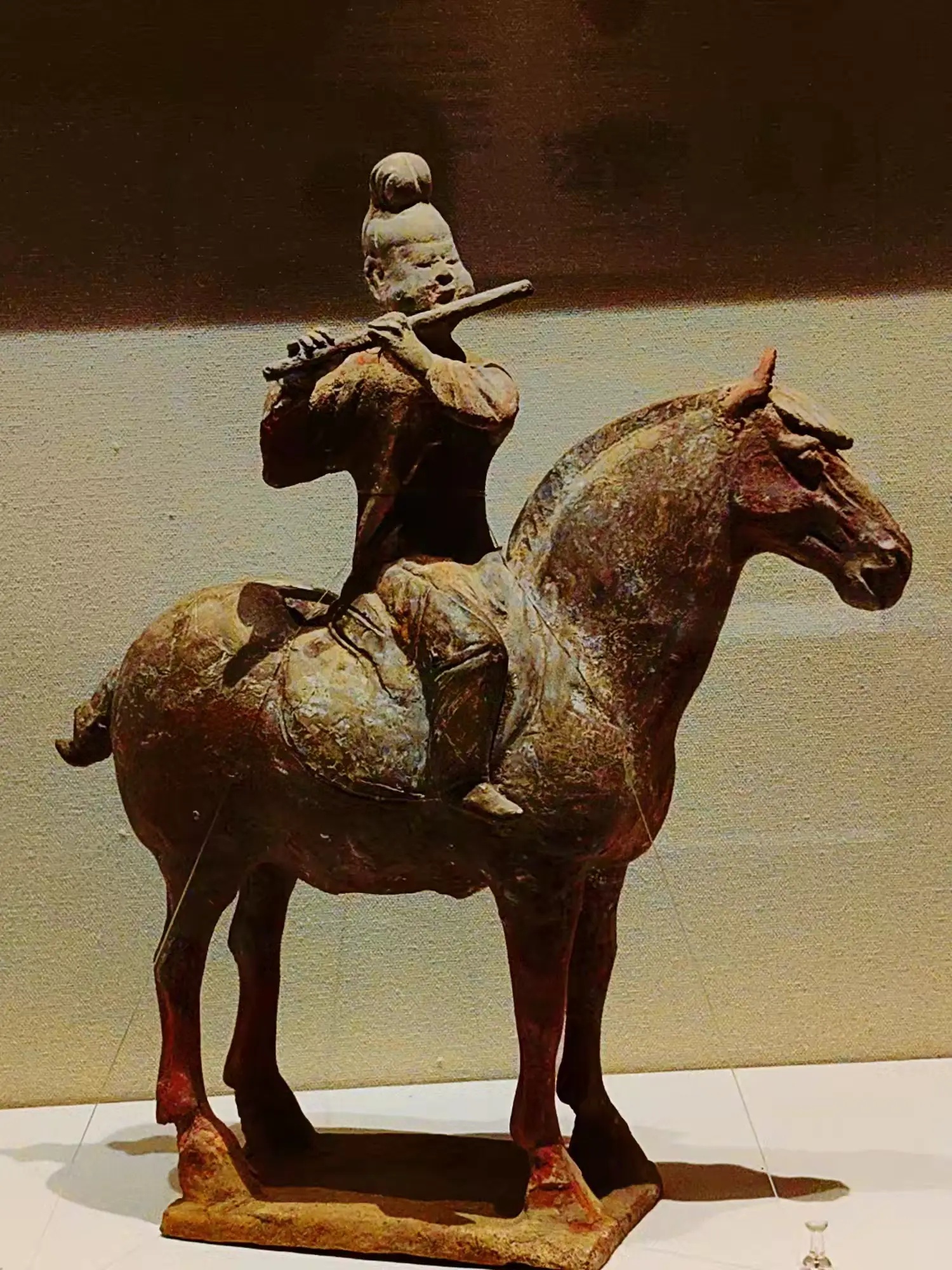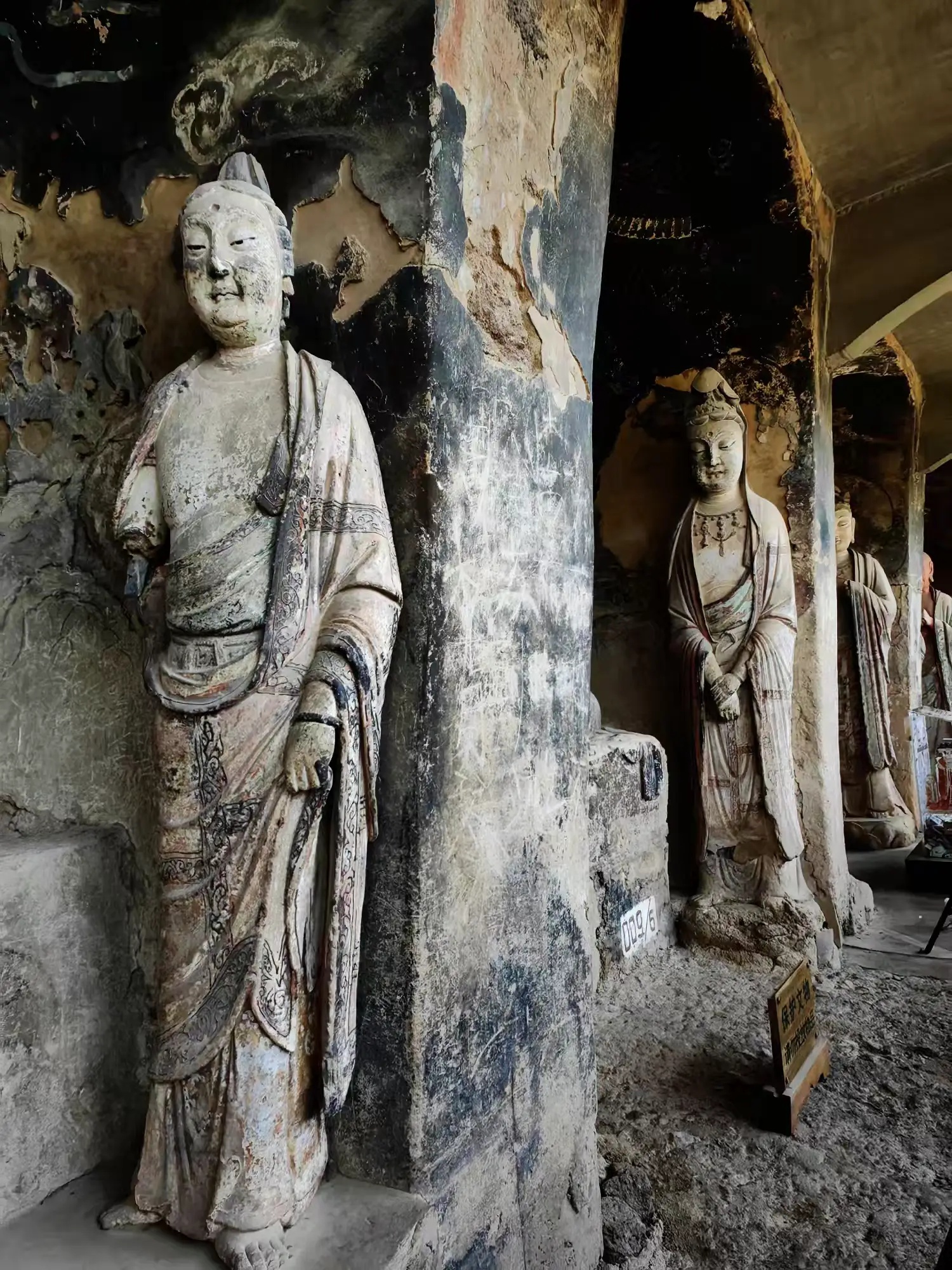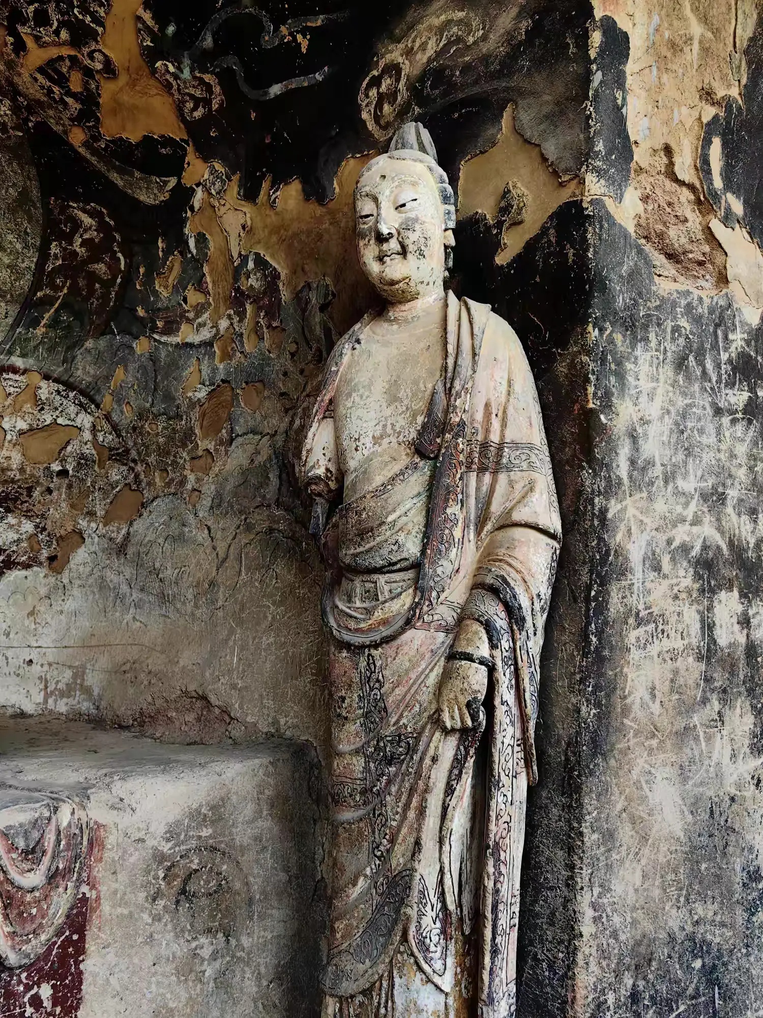 石窟的壁画同样令人震撼。飞天飘逸,菩萨端庄,线条流畅,色彩绚丽。我们重点看了窟顶上的几组壁画,飞天脸部,手臂等部位是微微突起的,十分动感,而衣服纹路,彩色飘带乃用线条画出,这种立体感就是壁画与浮雕结合的“薄肉塑技法”,这仅在麦积山石窟才能看到。