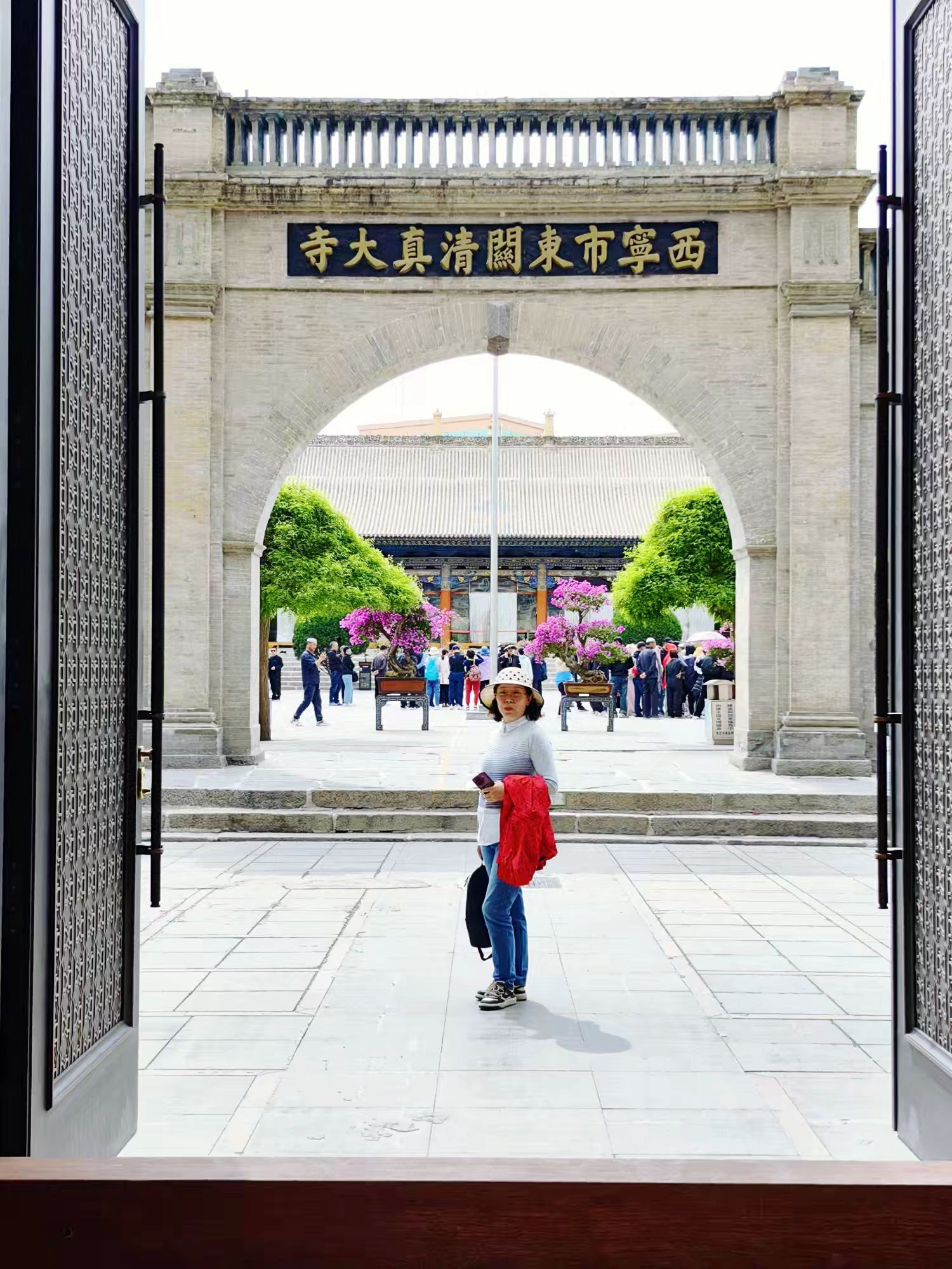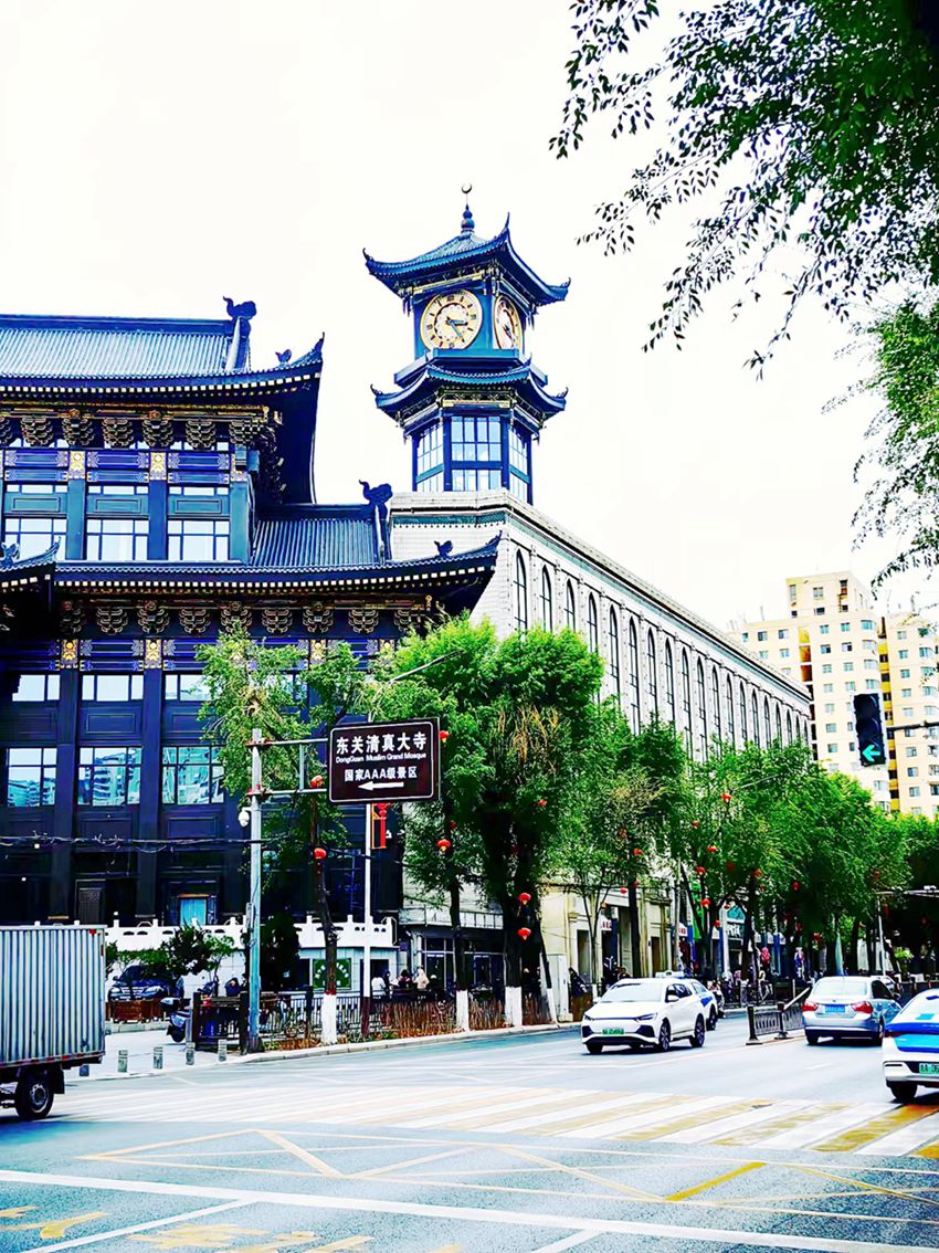 五月的风轻轻吹拂,带着高原特有的清冽。走出酒店大门,阳光格外明亮,照得人睁不开眼。远处的山峦起伏,天空蓝得纯粹,仿佛触手可及。我们决定先去东关清真大寺看看。十分钟的路程不算太远,穿过热闹的街巷,东关清真大寺渐渐映入眼帘。那一刻,我被它的宏伟与庄严深深震撼。大寺的穹顶高耸入云,金色的装饰在阳光下褶褶生辉,仿佛是天空中飘落的一颗璀璨明珠,照亮了周围的一切。