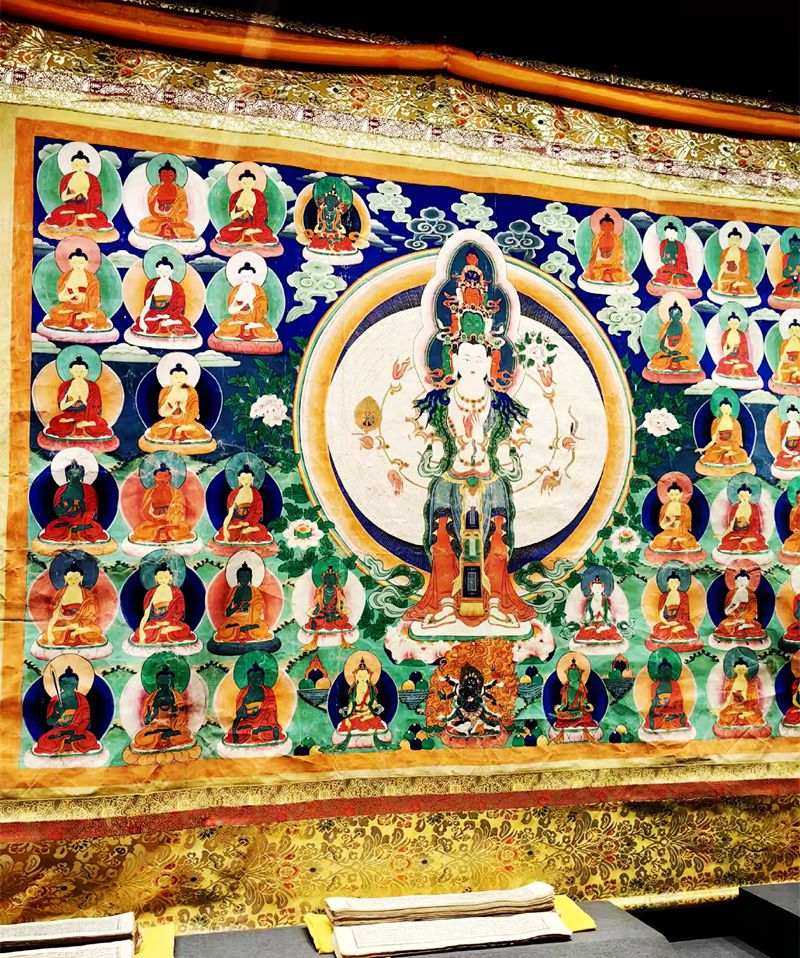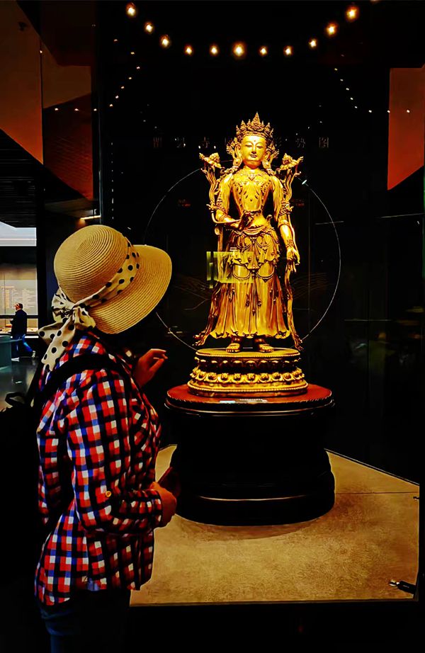 在三楼,我们看到了珍贵的唐卡和佛教造像。一幅巨大的绿度母唐卡尤其引人注目,菩萨面容慈祥,衣袂飘飘,周围环绕着祥云和莲花,有一种宁静祥和之气。特别令人难忘的是“丝绸之路青海特展专区”。展柜中的汉代铜镜、唐代三彩、波斯银币等文物,无声地诉说着青海作为古丝绸之路重要通道的辉煌历史。
