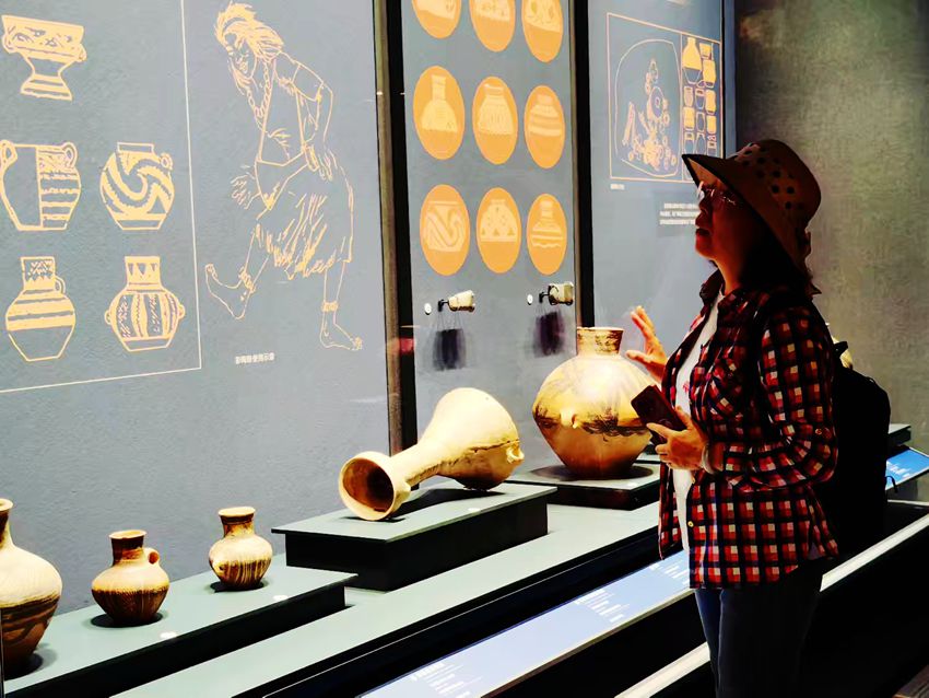 一楼展厅陈列着远古时期的石器、骨器和陶器。最吸引我的是一个彩陶罐,上面绘着舞蹈的人形图案,线条简洁生动。讲解员说这是新石器时代马家窑文化的代表,距今已有五千多年的历史。我凑近玻璃柜仔细端详,那些舞动的身影仿佛穿越时空,诉说着远古先民的生活。