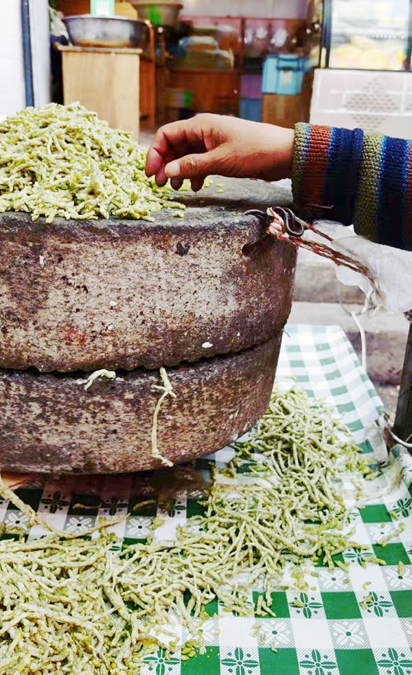 青稞面摊位前围满了食客,老板正用力推着石磨,洁白的青稞粉从磨盘缝隙中缓缓流出,像一条细小的瀑布。他动作娴熟,每一堆都带着节奏感。面粉的清香混合着夜晚的微风,让人忍不住深吸一口气。