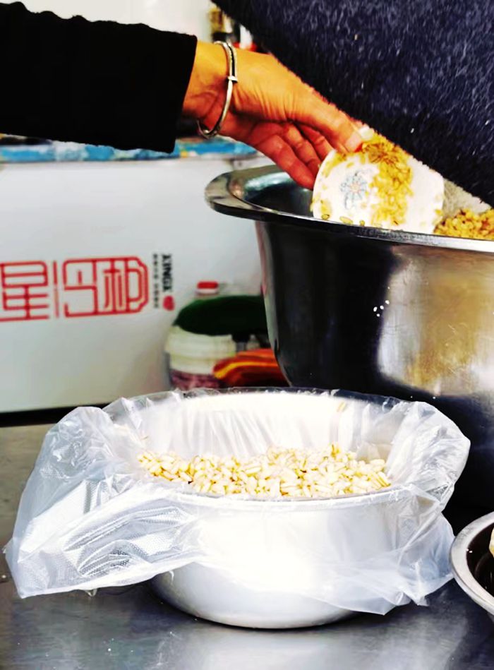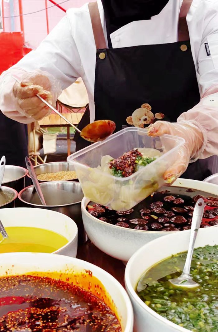 街角的甜醅摊前,老板娘正在舀着发酵好的青稞。甜醅装在透明塑料杯里,米粒饱满,散发着淡淡的酒香。喝一口,甜中带酸,清凉解腻。隔壁的酿皮摊上,黄澄澄的酿皮切成细条,浇上辣椒油和蒜汁,好吃的不得了。