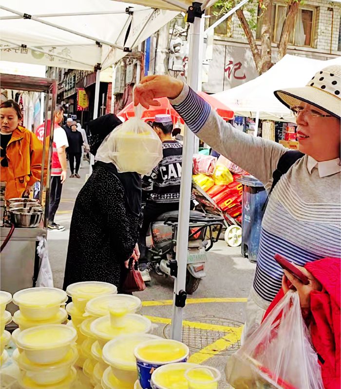 我们在一家老字号前停下脚步,老板热情地招呼着,从冰柜里取出几碗自酿酸奶。酸奶表面凝结着一层淡黄色的奶皮,用勺子轻轻一碰就破了。入口酸甜适中,带着浓郁的奶香,在舌尖化开的一瞬间,整个人都为之一振。