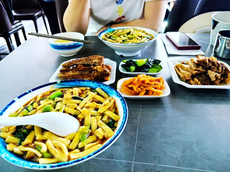 一会饭菜端上桌,原来所谓的“炒炮”是一种面食,因为形似鞭炮,故名“炒炮”。搭配香酥可人的排骨和味道醇厚的卤肉,以及清新解腻小菜,每一口都是对味蕾的极致诱惑,味道真是绝了。我平时不爱吃面食,可“炒炮”却颠覆了我的认知,这种面条圆滚滚有劲道,入口顺滑,口感极佳。我和妹妹赞不绝口,两碗吃了个净光。