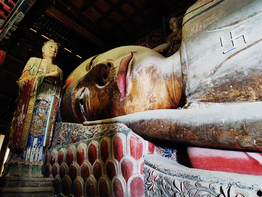 走进大殿,迎面是一尊巨大的卧佛。佛像安祥地侧卧着,面容慈祥,双目微闭。殿内光线昏暗,只有几盏长明灯发出微弱的光芒。我们学着其他香客的样子,双手合十,默默许下心愿。空气中弥漫着淡淡的香火味,让人不自觉地肃然起敬。