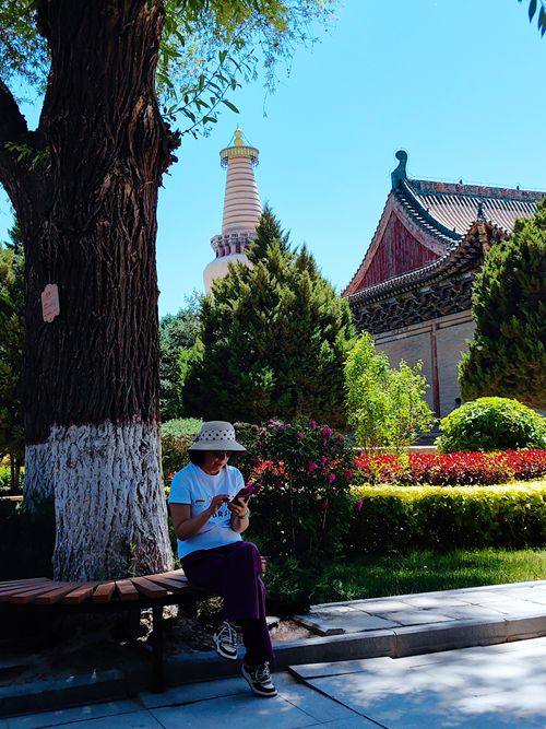 不知不觉已近中午,阳光变得强烈起来。白塔的影子缩短了许多,牡丹花也收起了晨露。寺院里的游客渐渐多了起来,说话声、脚步声打破了先前的宁静。我们坐在一棵老槐树下休息,树荫带来一丝清凉。