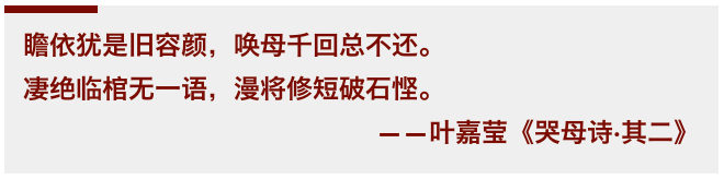 17岁,一向康健的母亲猝然倒下,从此再也没有醒过来,叶嘉莹第一次感受到生命的无常,强忍着悲痛料理完母亲的后事,数十天闭门不出,写下《哭母诗八首》,字字泣血,句句锥心。