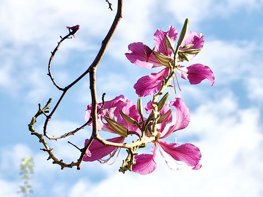 最奇妙的是颜色的层次。向阳处的花朵颜色最深,近乎紫红;背光处的则较浅,透着淡淡的粉。风过时,花瓣轻轻颤动,偶尔会有一两片随风飘落,在空中打了个旋儿,才不情不愿地落在地上。树下已经铺了一层薄薄的花瓣,踩上去软软的,几乎没有声响。