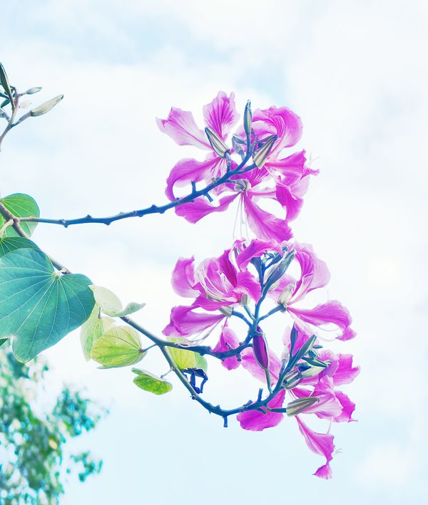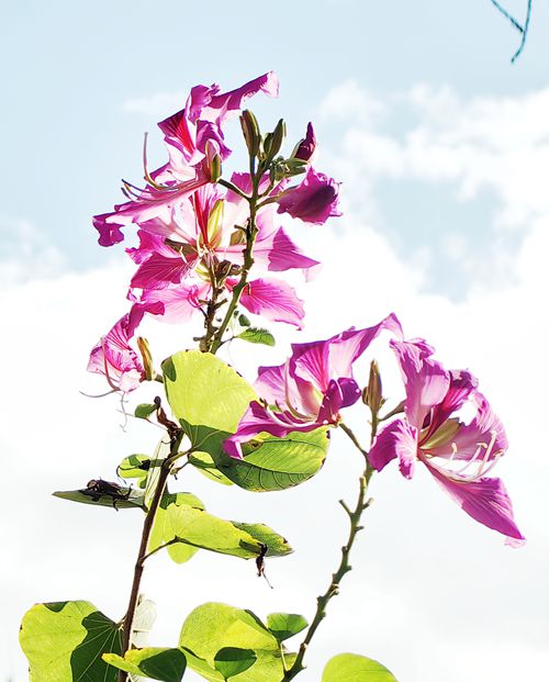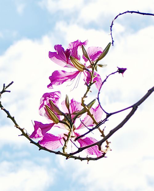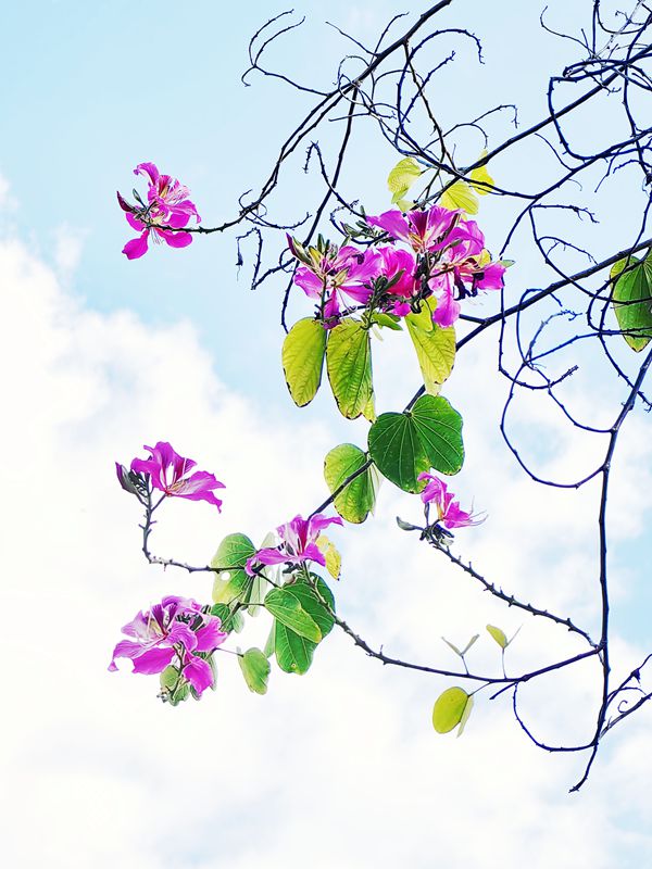 今天出门时,天气格外的好。清晨下过一阵小雨,这会儿天空像被洗过一样,蓝得纯粹透亮。几朵白云悠悠地飘着,不急不缓。离医院还差一站路时,我又看到了那片花海,经不住诱惑我提前下了车,朝着那片紫荆花走去。