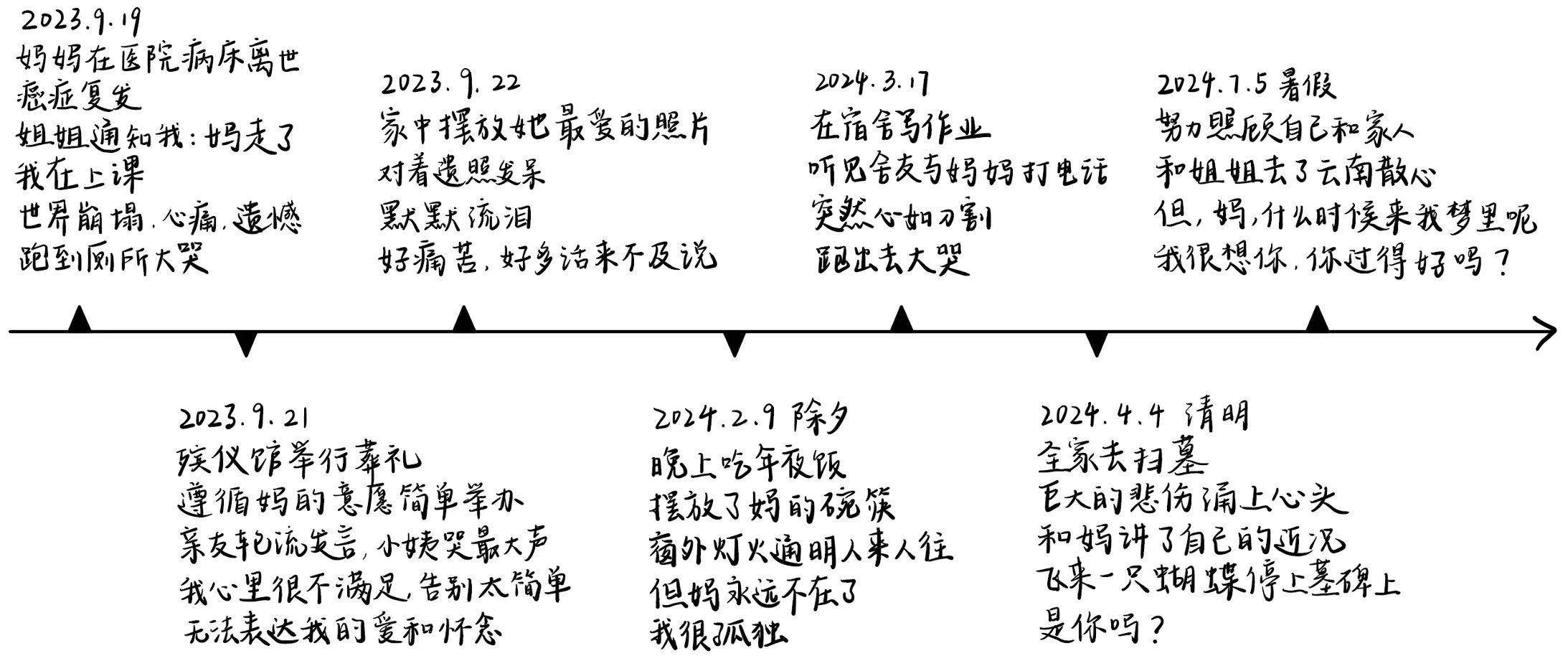 这是一位母亲因癌症去世的女大学生画的哀伤故事线。从上课接到电话,到举行葬礼、回家摆放遗照,到妈妈死后过的第一个除夕、听到室友给妈妈打电话、第一个清明扫墓,再到暑假旅行散心,她可以从中看到自己在这个过程中的变化。