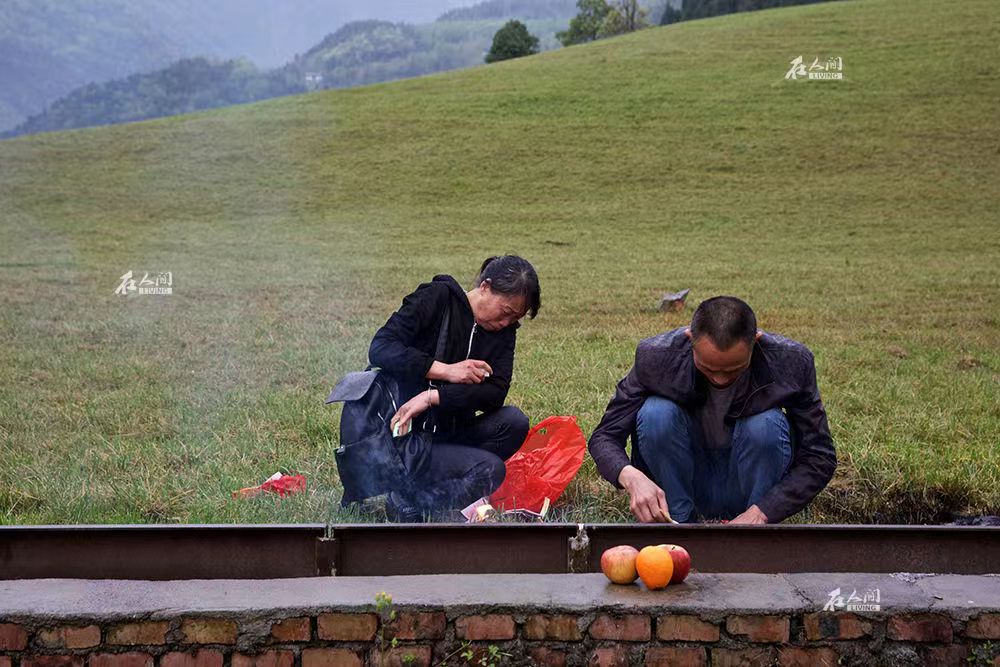 夫妇俩在北川中学集体公墓为女儿烧纸,马英回想起女儿再次泪流满面,沉默了一路的陈川在火堆前默默地念着:“你跟妹妹(表妹)在这里一起都十年了。”