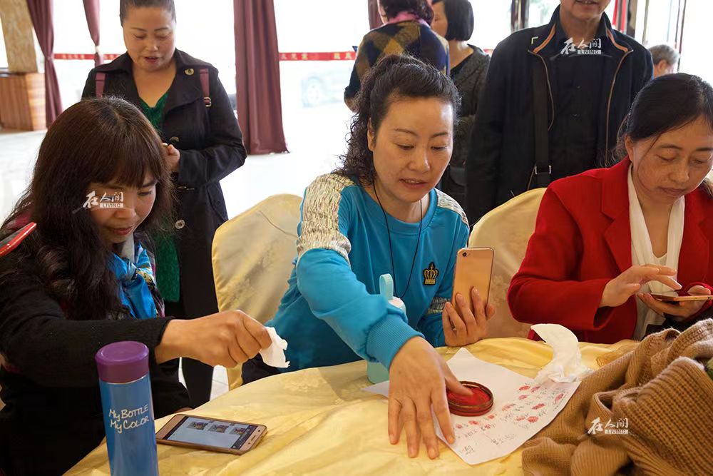 4月14日,柔姐(中)来到失独聚会场地,按照惯例,每一个参加的失独父母都会先按手印签到。李涛(右)曾经很害怕参加这样的聚会,“不知道聚会是什么状态,怕大家坐在一起说过去,怕在外人面前哭,怕被人同情。”但活动现场的欢乐很快让她的担心烟消云散了。