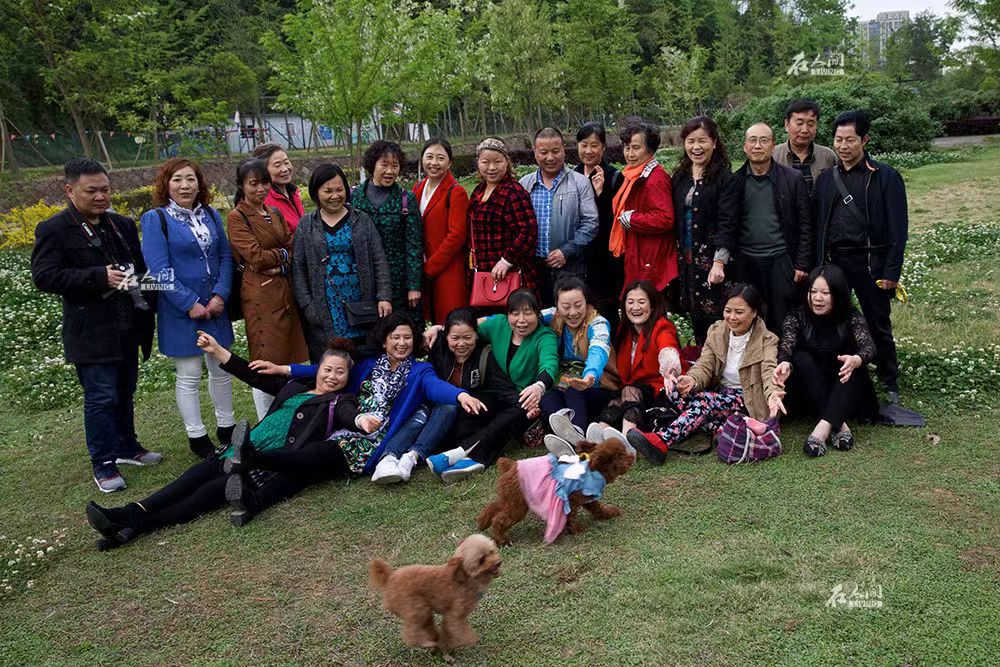 4月的聚会接近尾声,群友们在湿地公园合影留念,两只被失独父母们称为“女儿、儿子”的宠物狗突然闯入镜头。