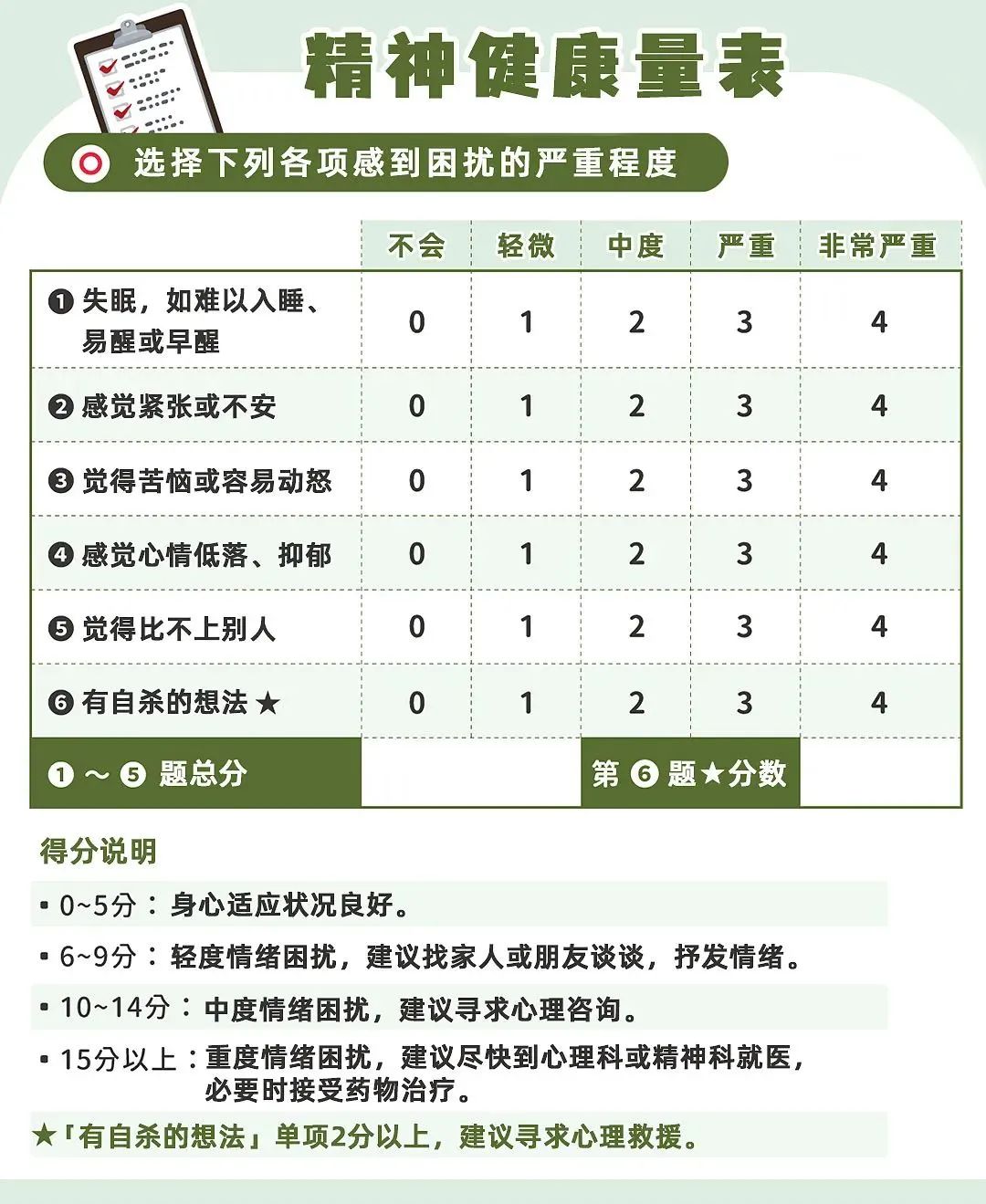 我们可以根据下面表格进行简单筛检,了解自己的心理健康状况。